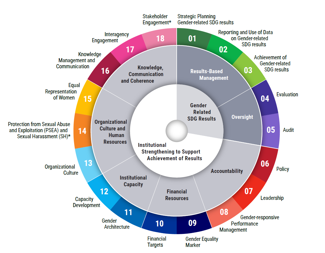 The UN-SWAP 3.0 requires an entity’s self-assessment against 18 common system-wide performance indicators clustered into seven broad functional areas: 1) Results-based management 2) Oversight 3) Accountability 4) Financial resources 5) Institutional capacity 6) Organizational culture and human resources 7) Knowledge, communication and coherence.